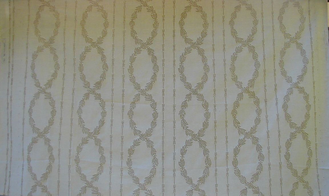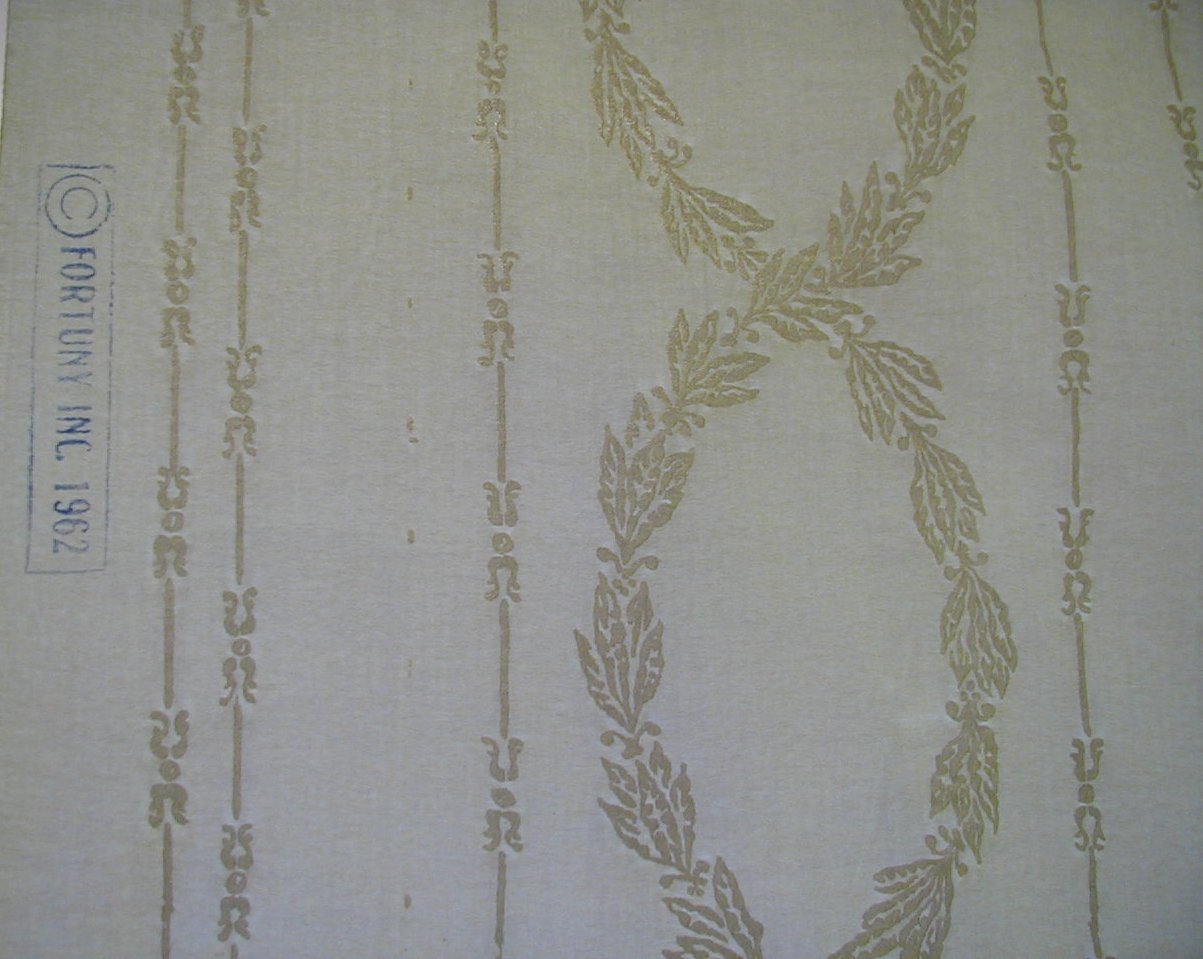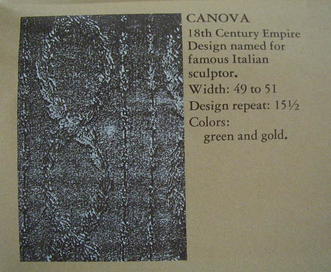 Canova a discontinued pattern. This samples is dated 1962 with the Fortuny Inc stamp. Further reference was found on a rare 1950's advertising fold out poster. See image to right. 5305 Bayou Green & Gold (1940's price list) |