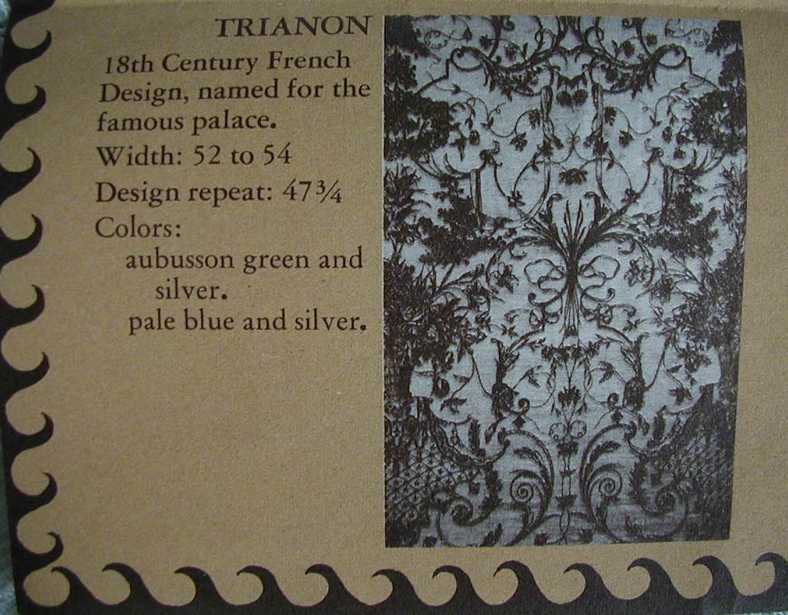 Trianon 18th Century French Design, named for the famous Palace. Pattern 52" wide on 54" ground. 47 3/4" vertical repeat. No border. |