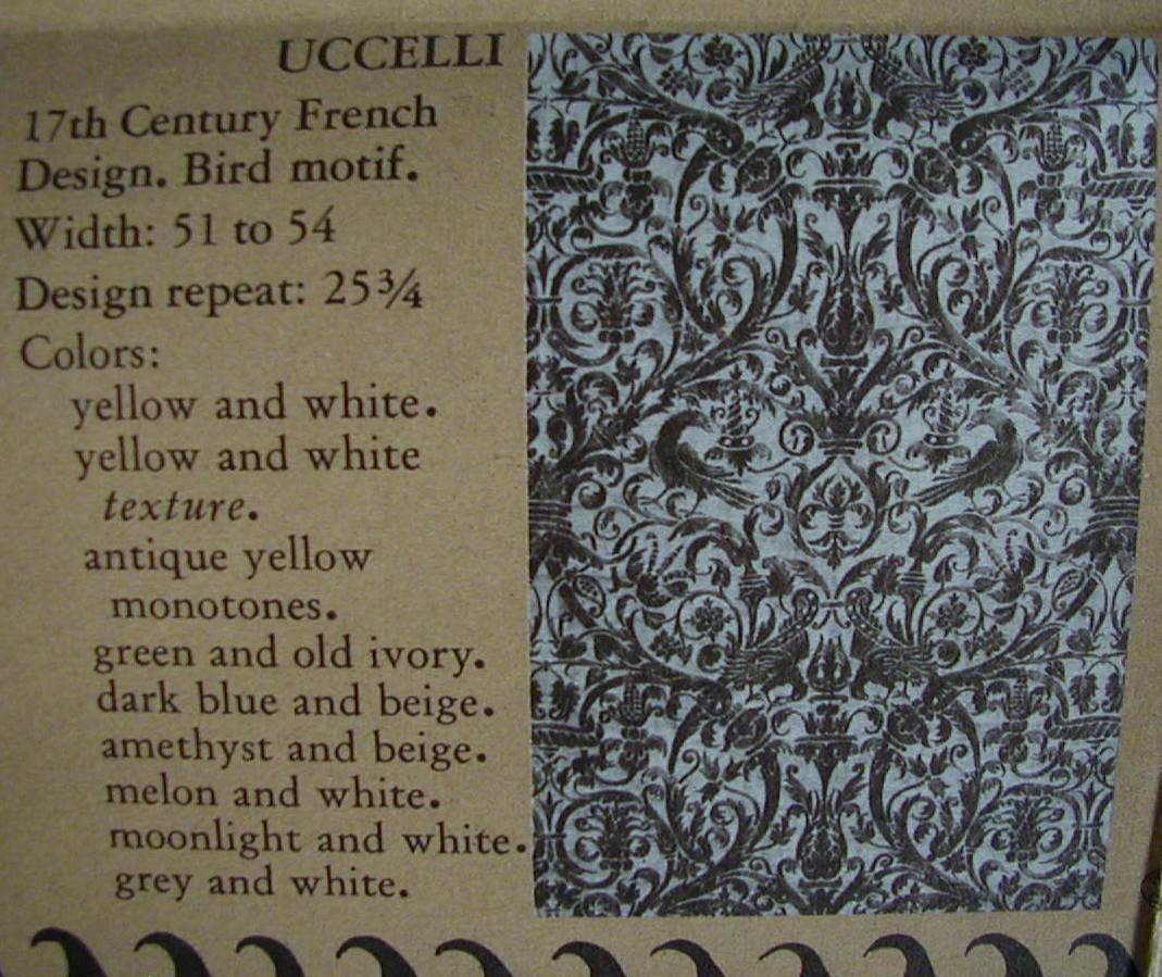 Uccelli 17th Century French Design. Bird Motif. Pattern 51" wide on 54" wide ground. 26" vertical repeat. No border.