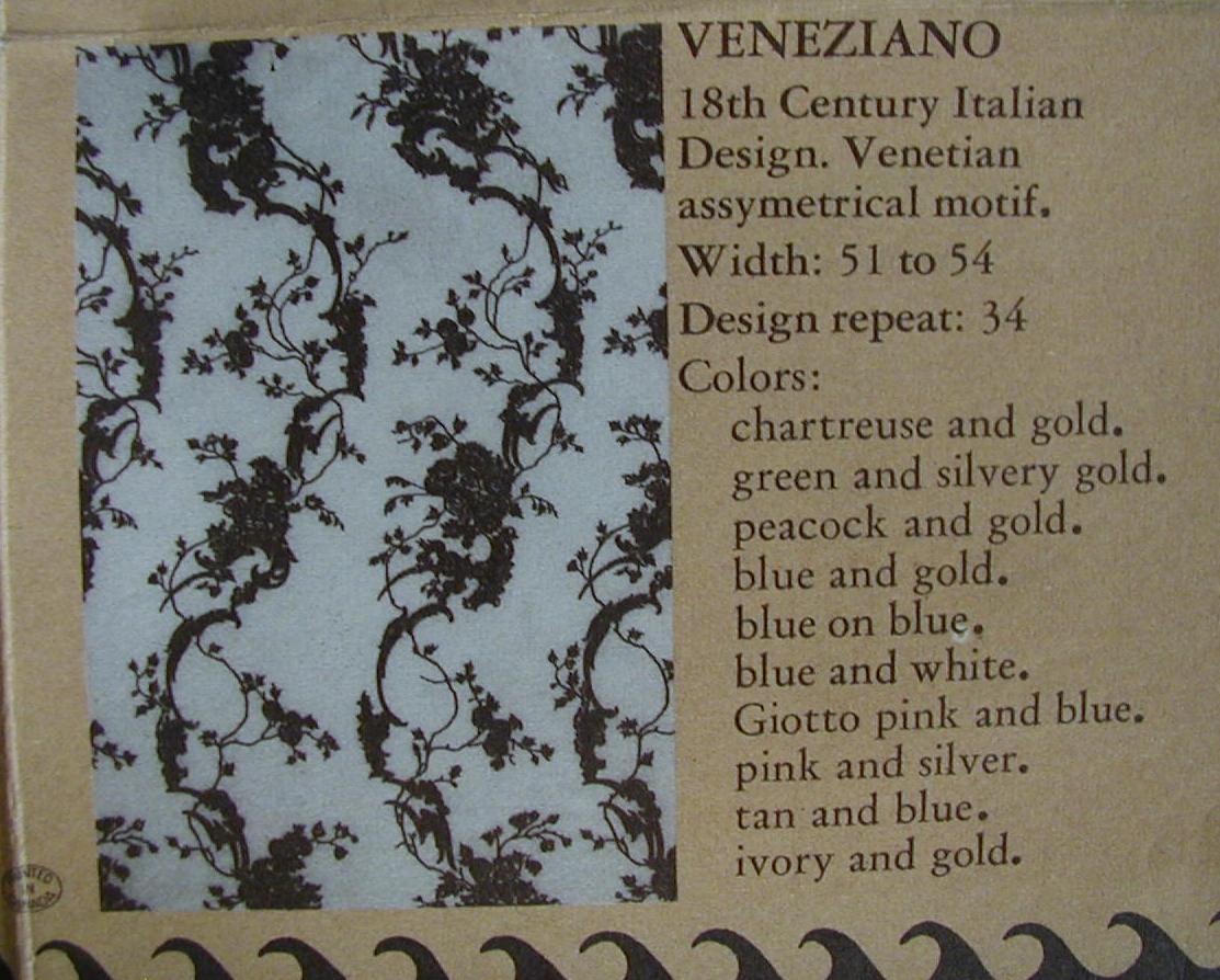 Veneziano 18th Century Italian Design. Venetian assymetrical motif. Pattern 51" wide on 54" ground. 34" vertical design repeat. No border. |