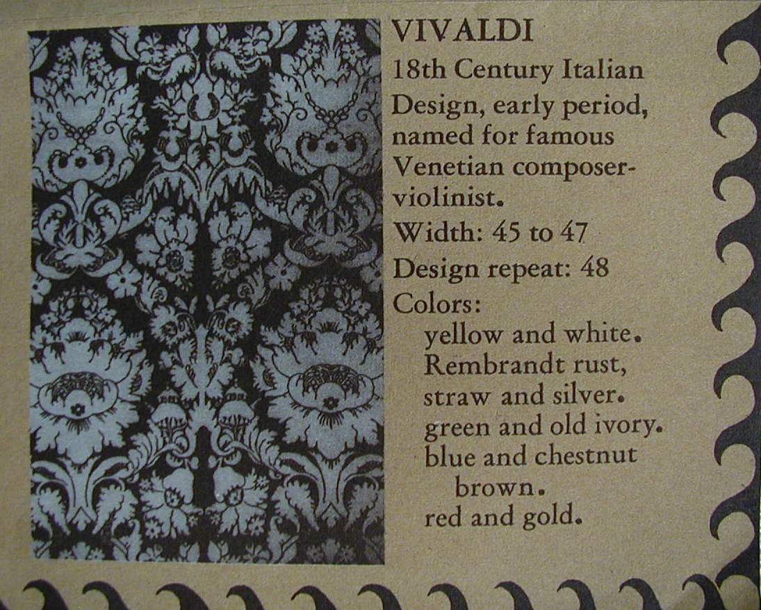 Vivaldi 18th Century Italian Design, ealry period, named for famous Venetian composer-violinist. Pattern 46" on 53" wide ground. 47 1/2" vertical repeat. Border on both selvages.