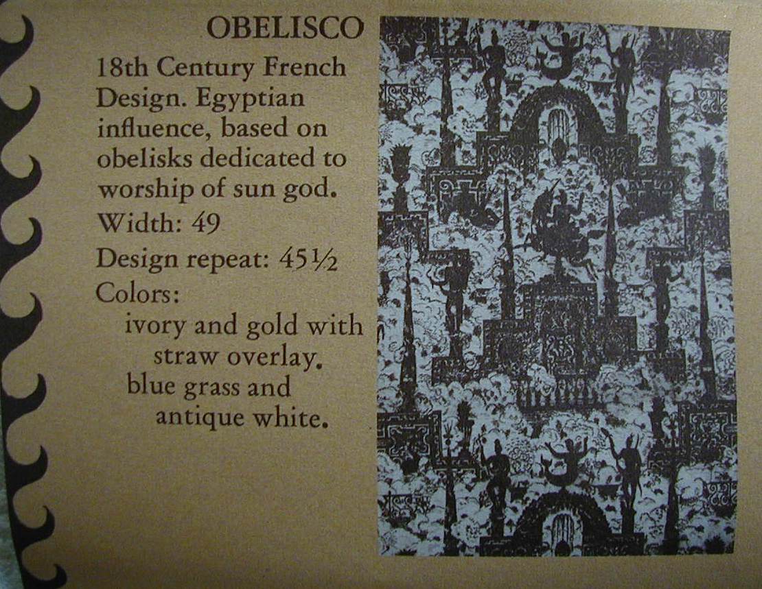 Obelisco (discontinued pattern) 18th Century Frenchors Design. Egyptian influence, based on obelisks dedicated to worship of sun god. Pattern 49" wide on 53" wide ground. 45 1/2 vertical design repeat. No border. |