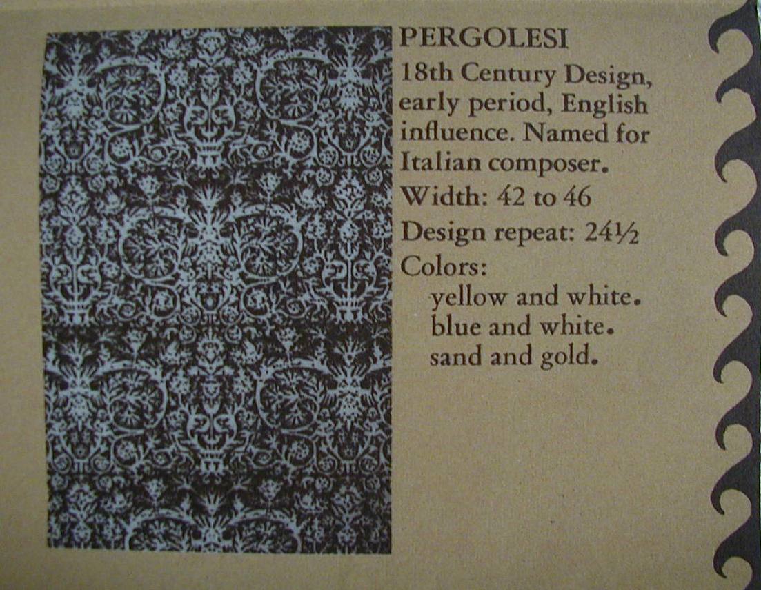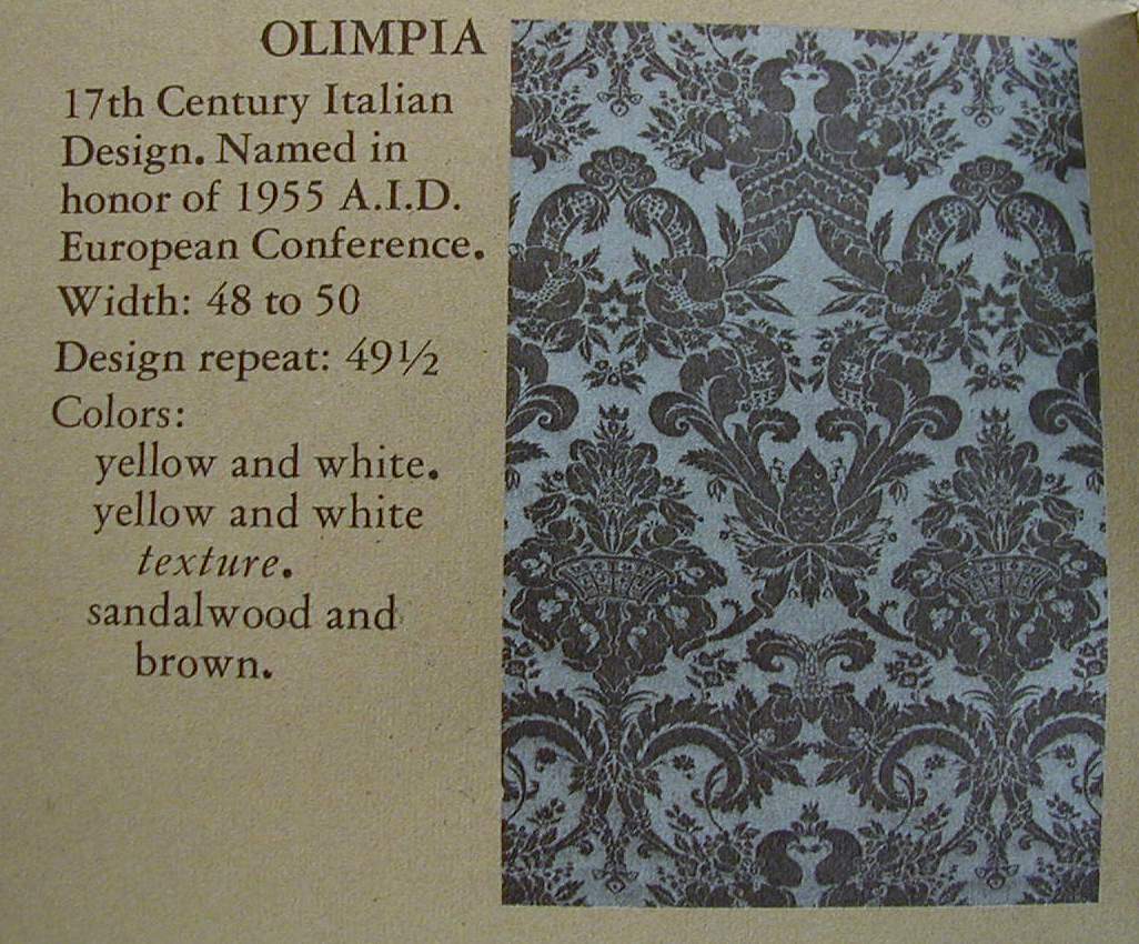 Olimpia 17th Century Italian design, Named in honor of 1955 AID European Conference. Pattern less border 49" wide on 54" wide ground. 49 1/2" vertical design repeat. Borders on both selvages. |