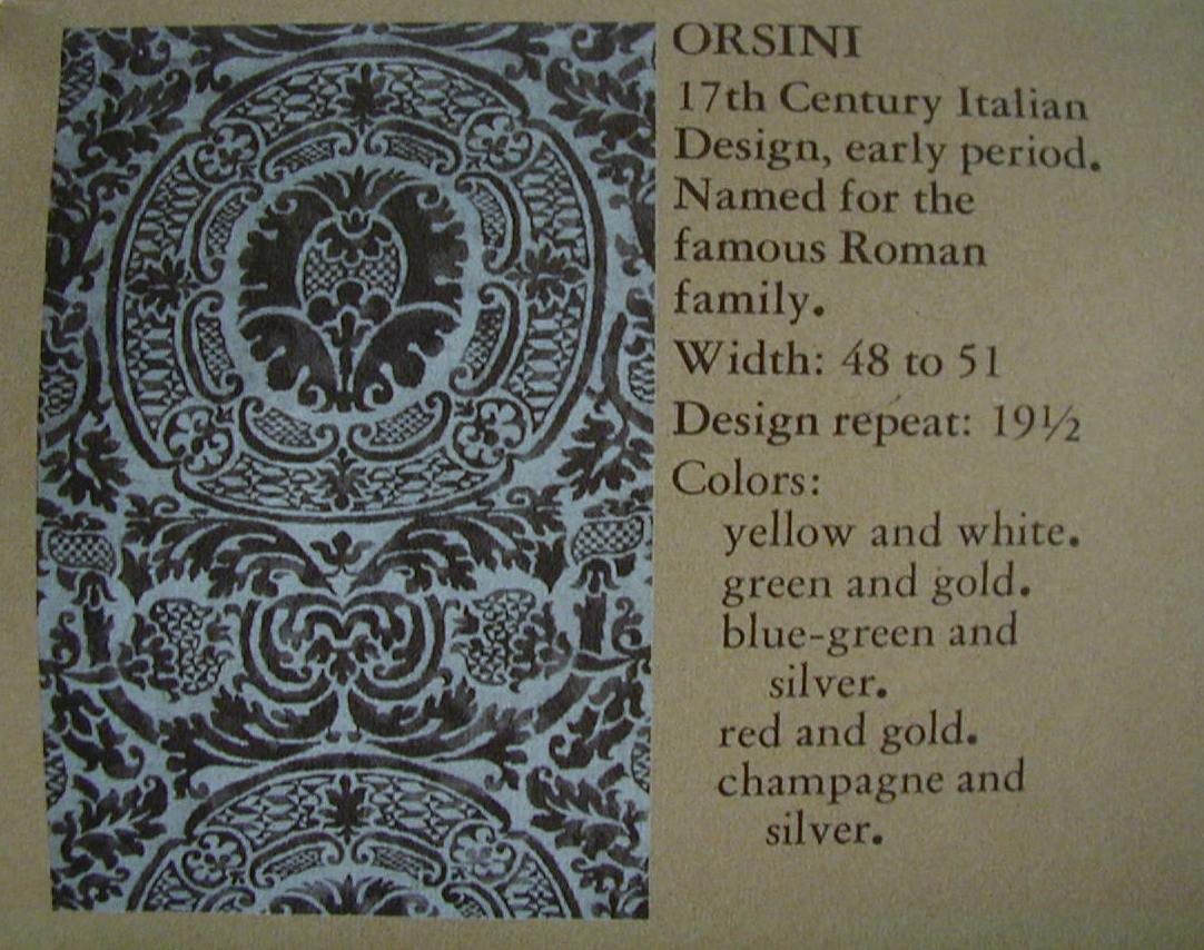 Orsini 17th Century Italian Design, early period. Named for the famous Roman family. Pattern less border 49" wide on 54" wide ground. 20" vertical design repeat. Border on one selvage. |