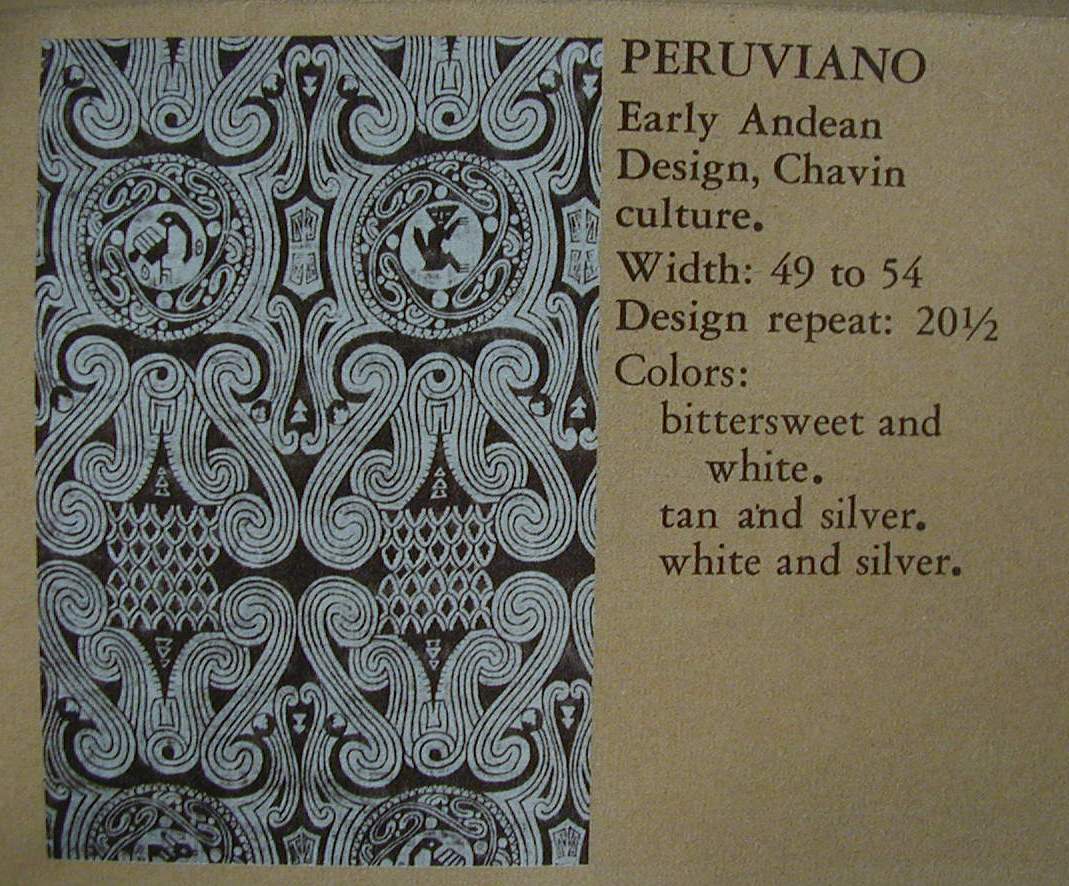 Peruviano Andean Early Andean Design. Chavin culture. Pattern 49" wide on 53" wide ground. 20" vertical design repeat. No border. |