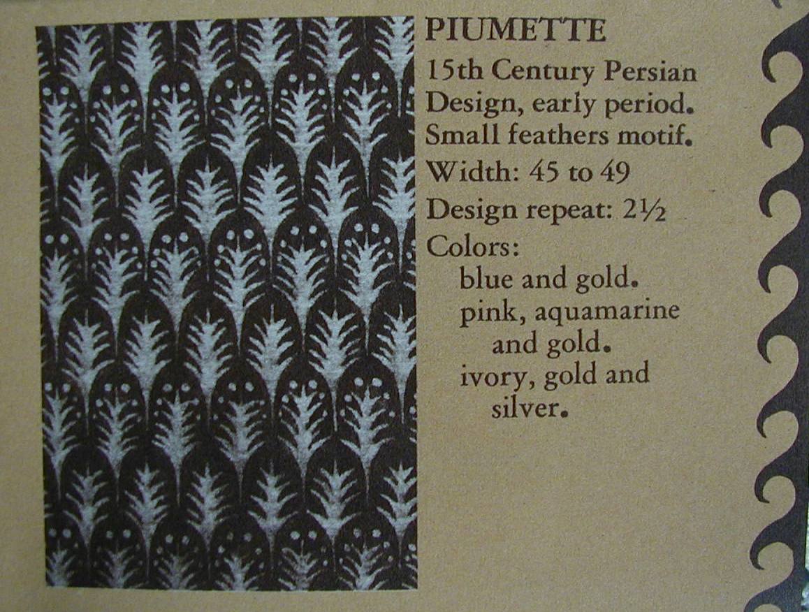 Piumette 15th C. Persian Design, early period Small feathers motif. Pattern less border 45" wide on 49" wide ground. 2 1/2" vertical design repeat. Border on both selvages. |