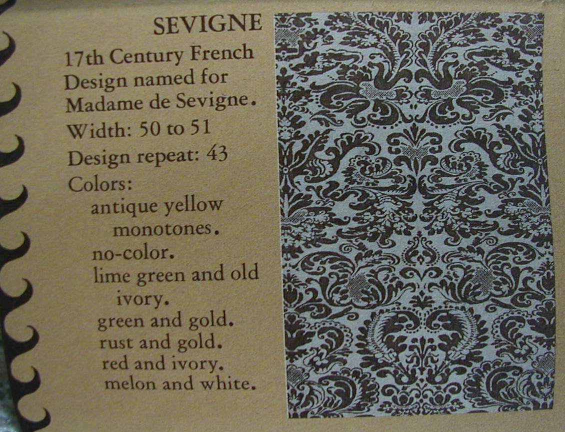 Sevigne 17th Century French Design name for Madame de Sevigne. Pattern 53" wide on 54" wide ground. 43" to 44" vertical design repeat. No border. |
