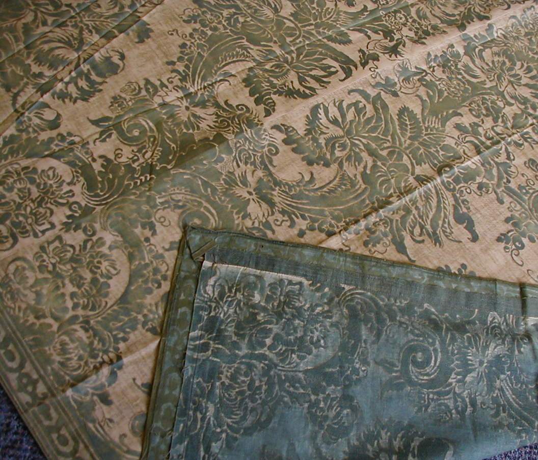 stamp,(Societa Anonima Fortuny), which Photo's show before and after. Above right and lower left the textile as found, upper left the finished piece lined and interlined, with rod pocket for hanging. |